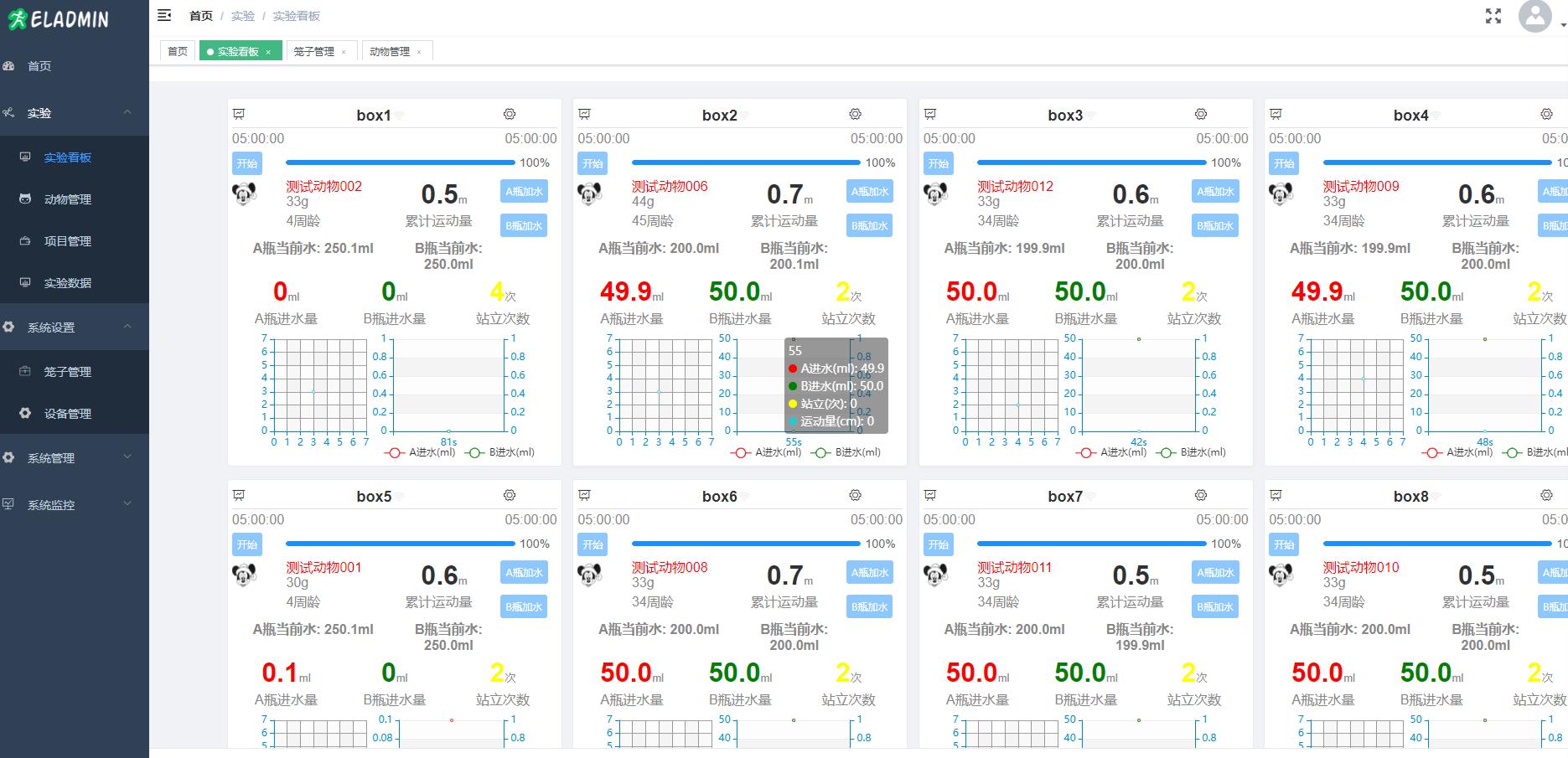 5、實驗看板:A槽剩余量、B槽剩余量、A槽消耗量,B槽消耗量,活動量,活動圖,站立次數(shù)行為,數(shù)據(jù)并導(dǎo)出到excel